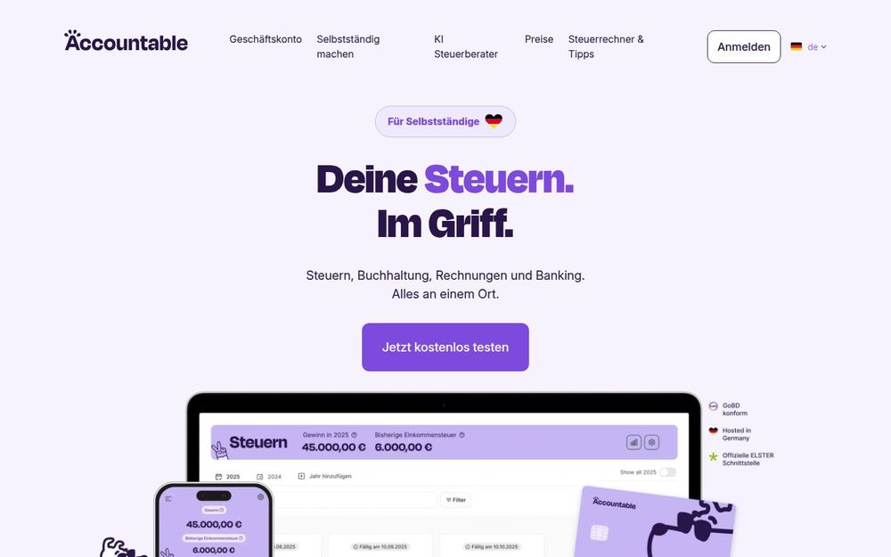 Accountable 是为德国的自雇者与小型企业主设计的一体化财务与税务应用。它把发票开具、支出管理、会计记账、税表申报与银行账户集中在同一平台,支持网页与移动端 App(App Store / Google Play)。Accountable 主打易用性与自动化,辅以人工税务教练与 AI 助手,目标是让没有税务背景的用户也能自行管理财务並按规定向税务局提交申报。