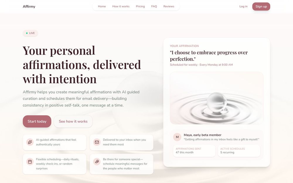 Affirmy 是一款以电子邮件为主要载体、结合 AI 辅助创作的肯定语句服务。它的目标是通过精准的文案生成、灵活的发送排程与长期记录机制,帮助用户把积极的自我对话变成可持续的日常习惯。无论是个人自我成长、为好友传递支持,还是为小组成员定期发送鼓励,Affirmy 都提供了从内容生成到发送与追踪的一整套体验。