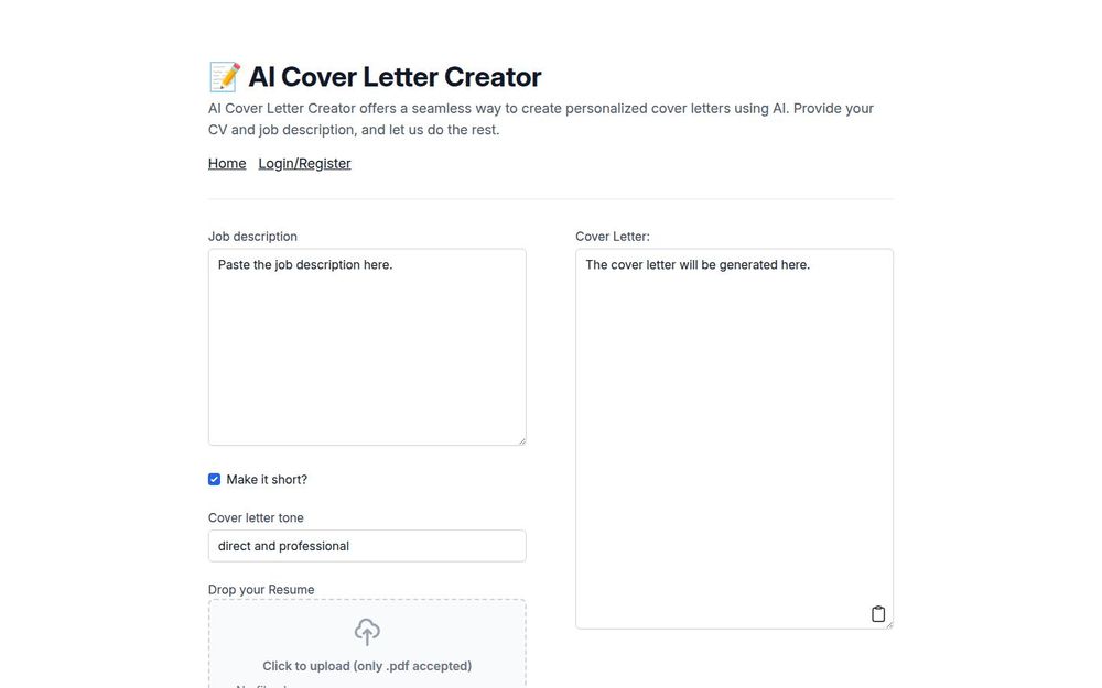 AI Cover Letter Creator 是一款以提升求职效率为目标的在线工具,通过人工智能自动生成针对性求职信。用户只需上传 PDF 格式的简历并粘贴目标职位的职位描述,选择合适的语气,系统便会根据提供的信息生成结构化的求职信草稿,节省编写时间并提高个性化匹配度。