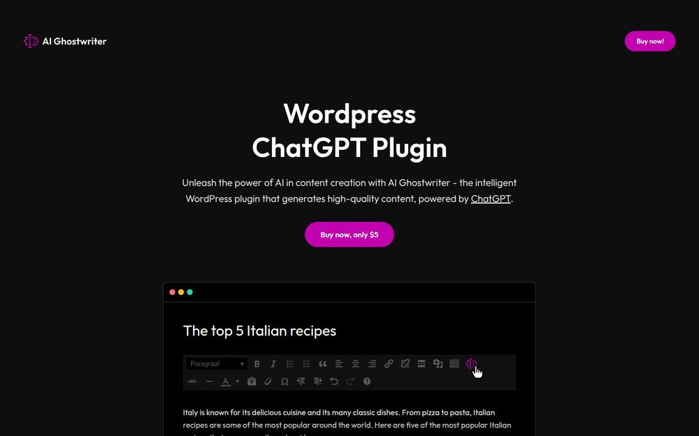 AI Ghostwriter 是一款专为 WordPress 平台设计的 ChatGPT 驱动写作插件,旨在将人工智能生成内容无缝集成到网站编辑流程中。插件通过直观的工具栏和后台界面,让用户在撰写文章时可即时生成段落、标题、摘要和配套元信息,从而大幅缩短内容生产周期并提升创作效率。官方网站提供实时演示和低价入手选项,便于试用和快速部署。