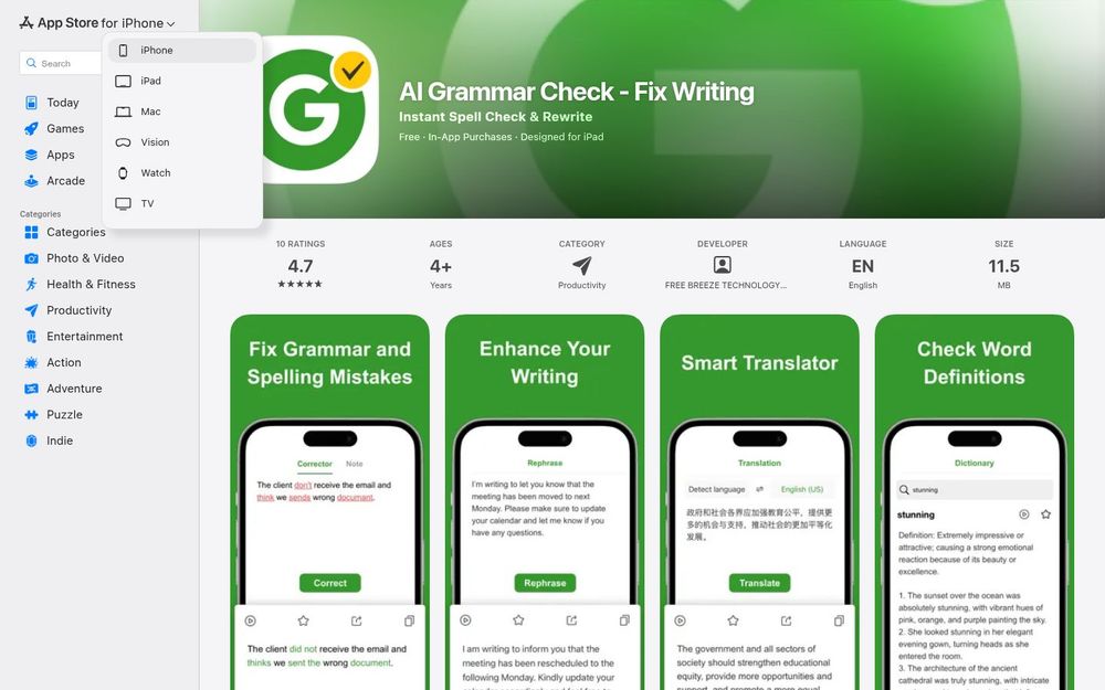 AI Grammar Check 是由 FREE BREEZE TECHNOLOGY LIMITED 推出的写作辅助工具,面向需要快速校对、润色或翻译文本的用户。该应用利用先进的 ChatGPT API 提供自动纠错、改写与多语种翻译功能,支持在 iPhone、iPad 与搭载 Apple M1 及更高芯片的 Mac 上使用,并通过 iCloud 实现跨设备同步。