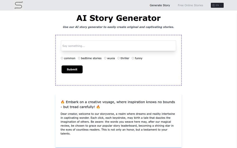 AI Story Generator 是一个面向大众的、强调易用性与社区规则的免费故事生成平台。无论是寻求灵感的新手、还是希望展示作品的作者,都可以在此快速生成、编辑并分享自己的故事,同时通过榜单获得更多读者关注。