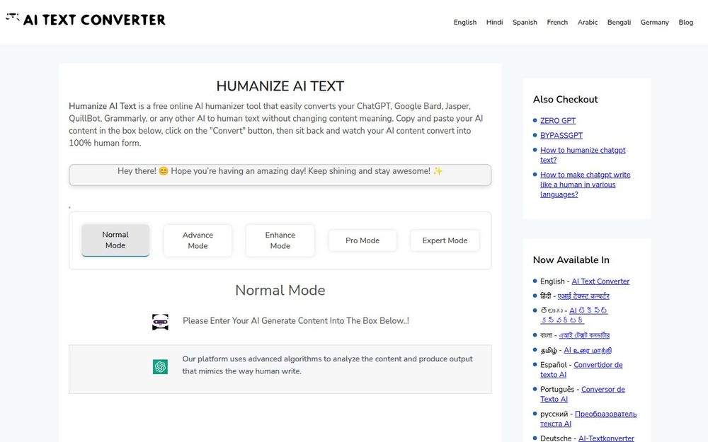 AI Text Converter(Humanize AI Text)是一款面向内容创作者的在线工具,核心目标是将各种 AI 生成的文本转换为更自然、更具人类表达风格的内容。该平台提供多种转换模式(Normal、Advanced、Enhance、Pro、Expert),主打“快速、免费、无需注册、无限次使用”的体验,适合博客作者、营销人员、教师和学生等希望提升文本可读性与亲和力的用户。