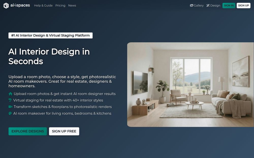 ai4spaces 是一款集 AI 室内设计、虚拟布景与建筑可视化于一体的平台。用户可以通过上传照片、手绘草图或 3D 渲染图,利用平台内置的 AI 引擎在数秒到数分钟内生成高质量的设计渲染、360° 全景、视频漫游及建筑图纸。平台面向房主、室内设计师、房地产经纪人及建筑专业人士,提供从灵感探索到商业交付的完整工具链。