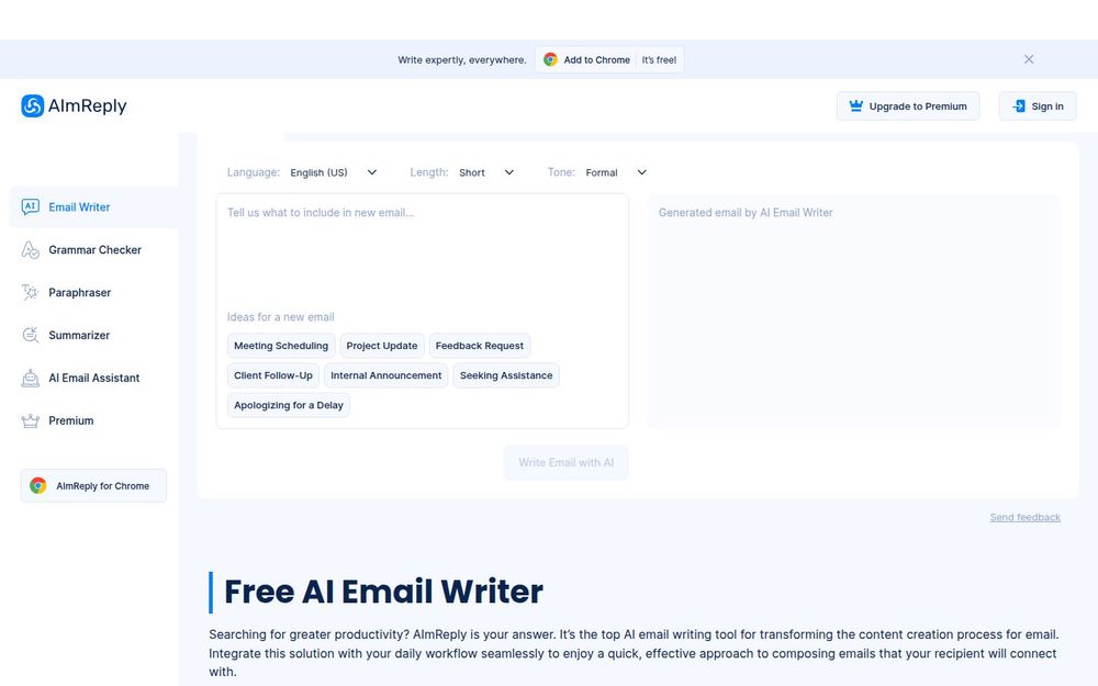 AImReply 是一款面向邮件写作与沟通场景的人工智能工具,定位为“Free AI Email Writer”。它通过大语言模型生成高质量、语气可控的邮件内容,并在界面上提供多语言、多语调和多长度的选择,帮助用户在数秒内产出专业且符合语境的邮件草稿。AImReply 同时提供语法校正、文本改写与摘要等配套工具,力求在一个平台内满足邮件撰写的全流程需求。
