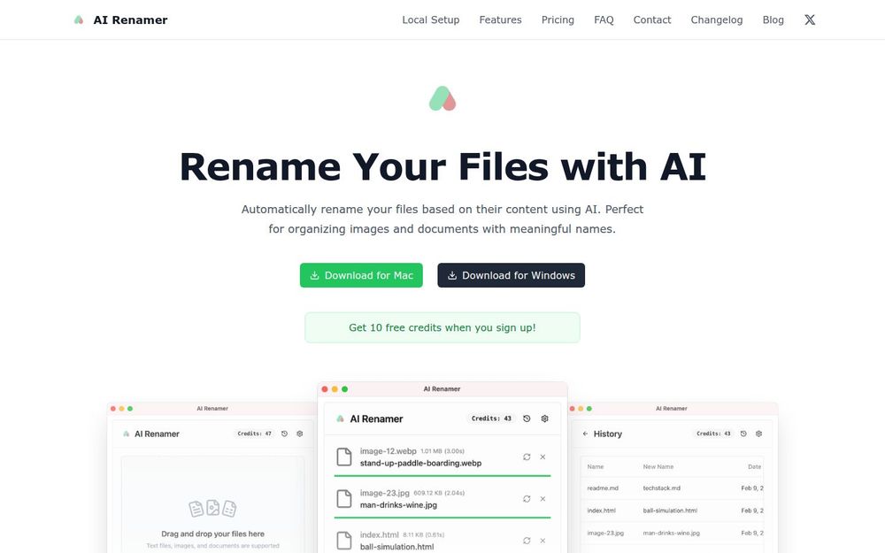 AI Renamer 支持常见图片格式(JPG、PNG、GIF、WEBP)和文本/文档格式(PDF、TXT 等文本型文件),并提供 macOS 与 Windows 的桌面客户端。本地模式不限文件大小并支持无限重命名,云端模式则对单文件大小有上限(例如 10MB),适合不同使用场景的权衡。