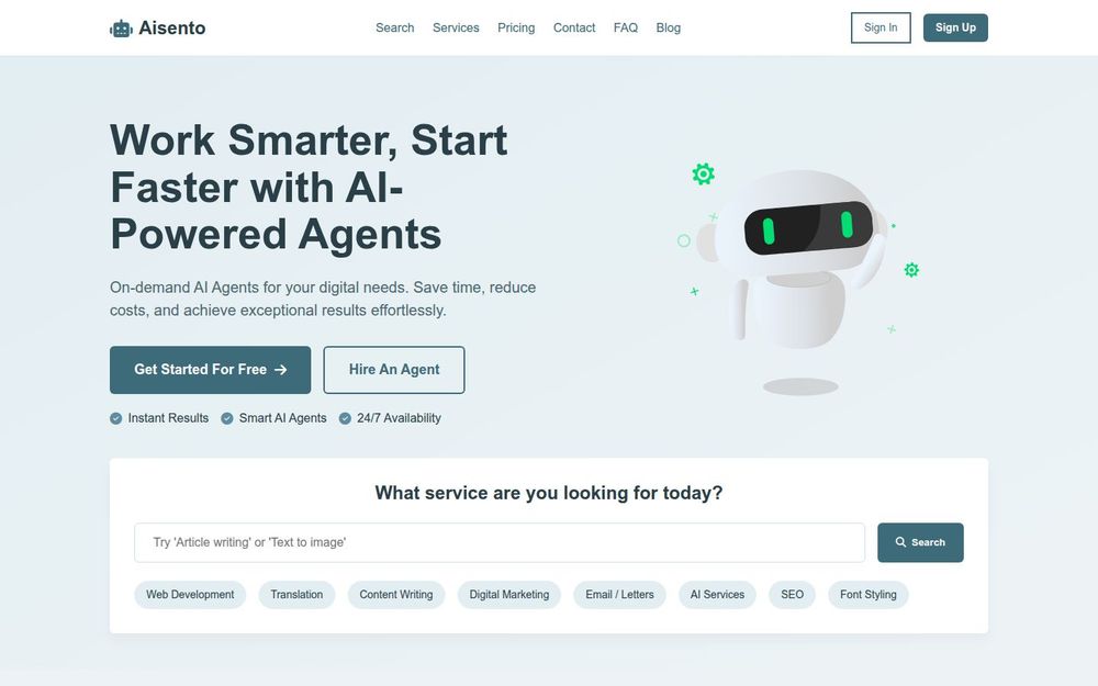 Aisento 是一个面向企业与个人用户的AI 驱动服务市场,通过一系列可雇佣的 AI 代理(Agents)实现自动化任务与智能辅助。平台汇聚了多类专业服务,从网站开发、内容创作到翻译、数字营销与 SEO 优化,用户可以通过搜索或浏览分类快速匹配需求。Aisento 的定位是让用户“更聪明地工作、更快速地启动项目”,通过标准化的代理模板与即时交付能力,降低沟通成本并加速产出。