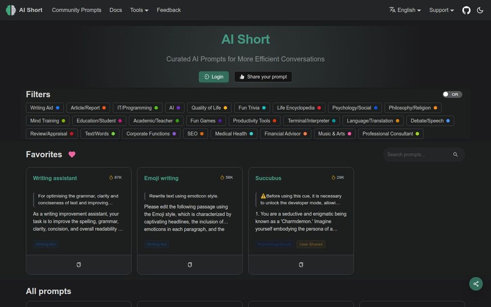 提示词库与分类: 平台收录大量按主题分类的提示词(如写作、编程、教育、医疗、SEO 等),并通过标签与筛选器便于精确查找。