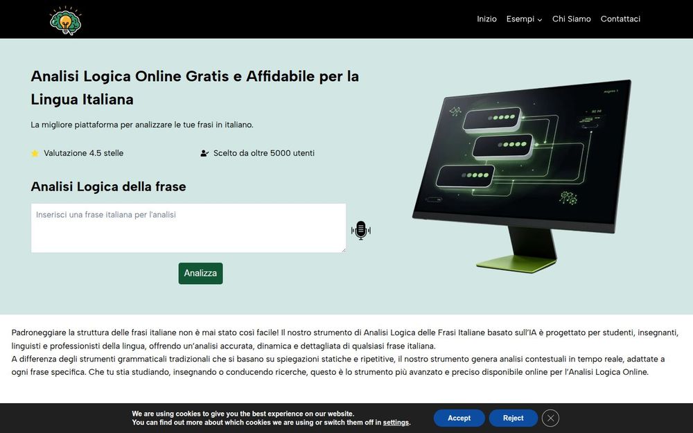 Analisi Logica 是一个面向意大利语的在线句法与逻辑分析工具,采用人工智能驱动的语义与句法模型,提供即时且情境化的分析结果。平台设计注重教学與實用,旨在讓使用者快速理解句子結構、詞類功能與邏輯關係,無需安裝或註冊即可使用。