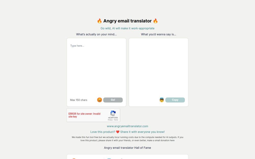 网站通过后台的 AI 模型解析用户输入的情绪化短句,识别其中的攻击性或情绪语素,然后生成语气平和、结构完整、尊重收件人的替代表达。工具在页面上展示原始文本与转化后文本的对照示例,便于用户评估效果。页面还集成了 reCAPTCHA 提示(页面上可能出现 site key 错误信息),并提供隐私与使用条款链接。