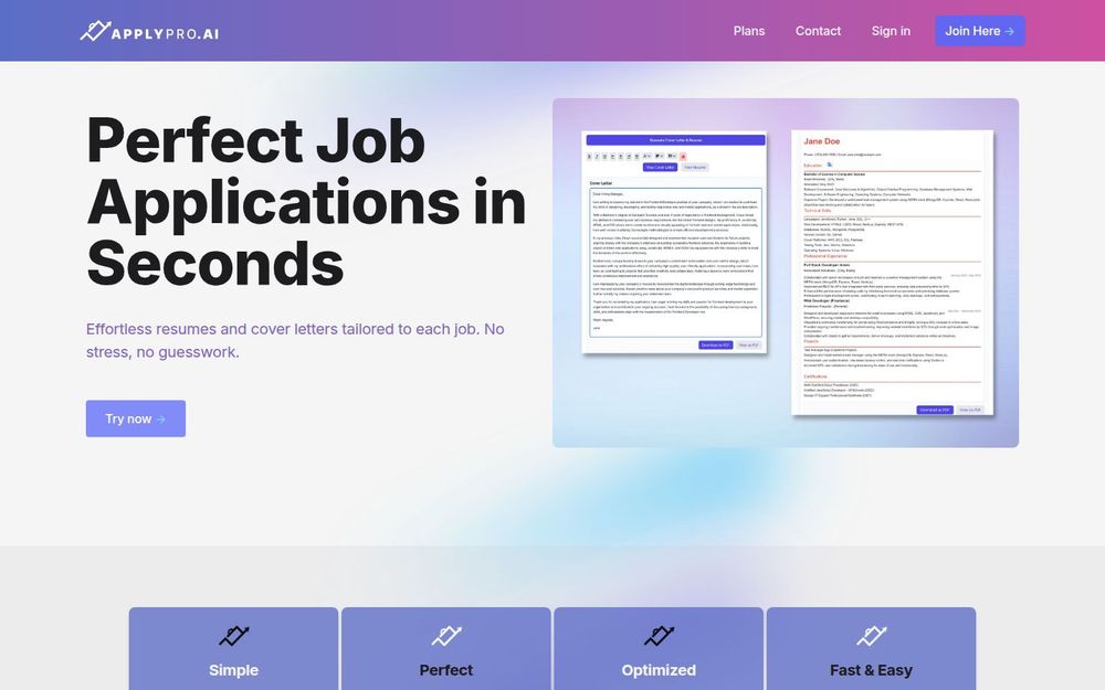 ApplyPro 是一款用于快速生成和定制简历与求职信的在线工具,目标是让求职过程变得更快、更简单、更专业。它通过 AI 自动解析职位描述并生成与岗位高度匹配的材料,减少了手工编辑和反复猜测的时间成本。产品强调隐私与安全,默认不保存用户简历或将其用于模型训练,适合关注数据安全的求职者使用。