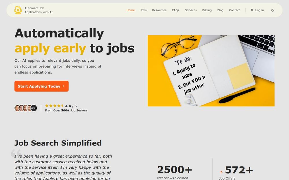 Applyre 是一款结合 AI 自动化投递 与 人工审核 的求职辅助平台,目标是让求职者将精力集中在面试准备与职业发展上,而不是花大量时间在重复性的申请流程中。平台全天候运行,持续扫描并投递匹配的职位,从而帮助用户在岗位发布初期就抢先提交申请,提升获得面试的概率。
