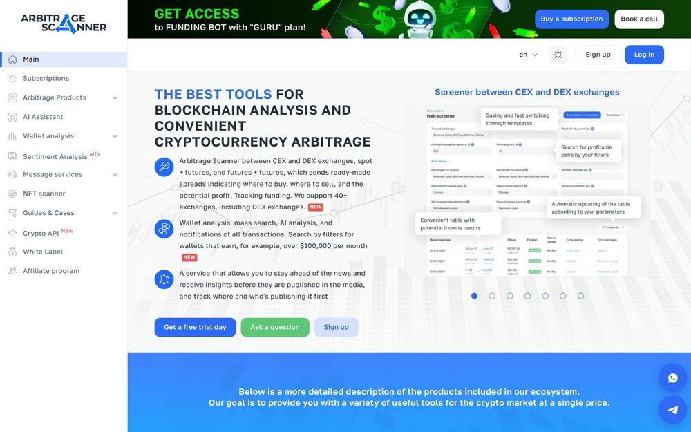 Arbitrage Scanner 是一款面向实操的套利与链上情报工具,集套利监控、钱包深度分析、AI 搜索与消息监测于一体,适合对冲型交易者、量化研究者及希望通过链上数据获取信息优势的用户。平台提供试用、案例与付费方案,可按需扩展为白标或企业级服务。