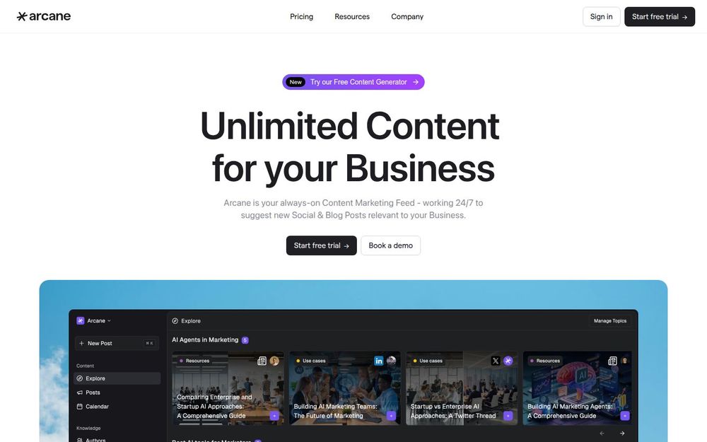 Arcane 适合希望规模化、系统化产出内容的创业公司与市场团队。它把AI 自动化与团队协作结合,减少撰稿与编辑的重复工作,同时通过日历与审批功能让发布流程可视化与可控。对于需要在有限资源下快速生成高质量、品牌一致内容的团队,Arcane 能显著提高效率、缩短从构思到发布的周期,并且降低对外包或人工写作的依赖。