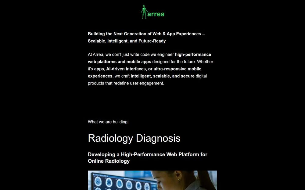 Arrea 致力于打造面向未来的高性能 Web 平台与移动应用,强调智能化、可扩展与安全的产品设计理念。官网展示了多个垂直领域的实际案例,包括医疗影像二次诊断平台、放射学报告数据库、新闻聚合器,以及面向普通用户的增强现实应用与 AI 图像生成工具。团队既具备前端与移动端体验的设计能力,也关注后端的高并发、隐私合规与工作流整合。