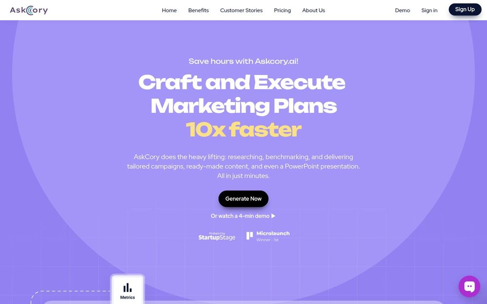 AskCory.ai 是由 Build Up Labs 推出的 AI 营销助理,旨在解决“空白页综合症”(blank page syndrome),帮助营销人员在极短时间内生成完整的营销计划与执行方案。平台结合行业基准、KPIs 和自动化内容生成,支持从策略到执行清单的端到端输出,并提供可导出的 PDF 与 PowerPoint(Beta)报告,方便团队共享与汇报。