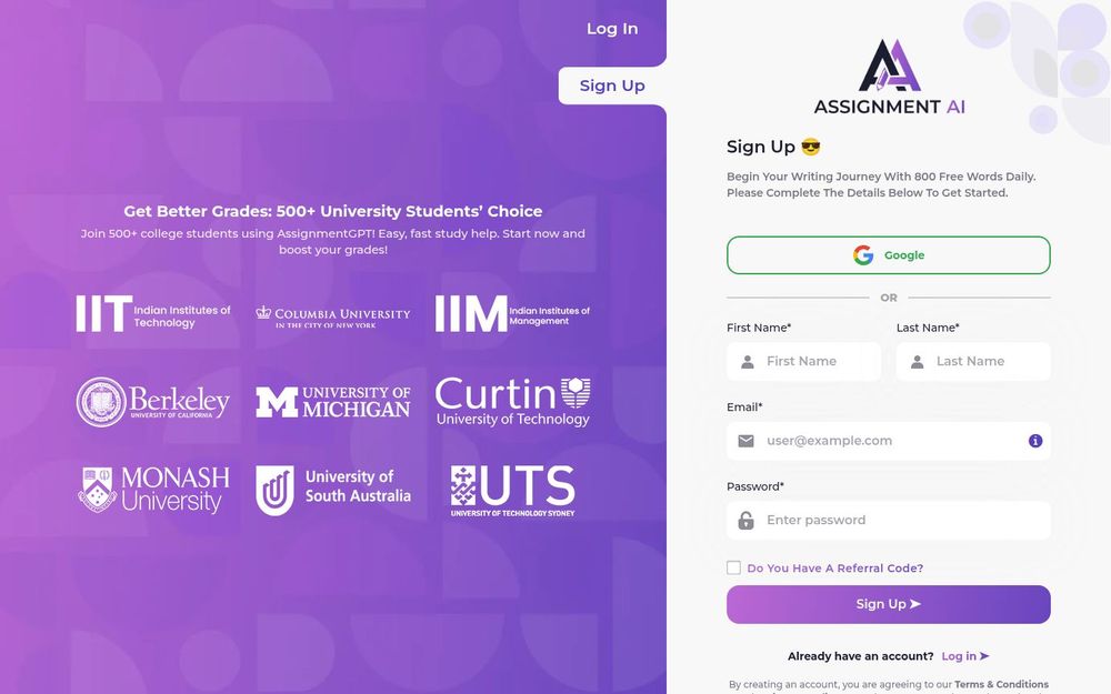 AssignmentGPT 是一款面向大学生的 AI 写作与作业辅助工具,主打“快速提升成绩、简化写作流程”的使用体验。平台提供每日免费写作额度(示例为每日 800 字),支持通过 Google 一键登录或填写邮箱和密码完成注册。页面同时提示有验证流程(如 hCaptcha)和第三方计费系统(Chargebee),并在注册页显著列出服务条款与隐私政策,以便用户了解使用规则与数据保护条款。