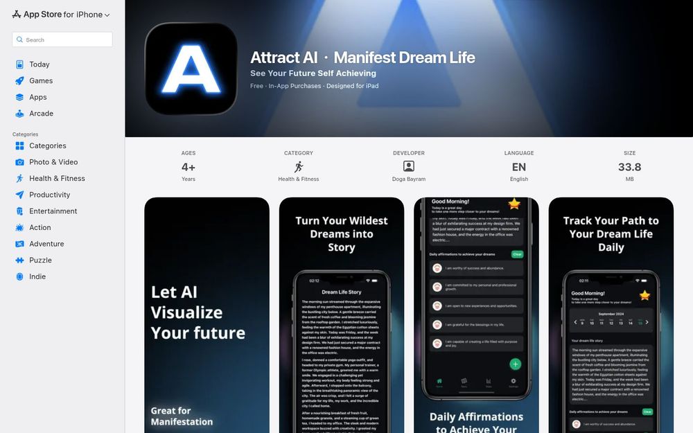 Attract AI 是一款以人工智能为驱动的自我成长与愿景显化工具,旨在帮助用户构建清晰的未来自我形象并通过日常实践逐步实现目标。应用将用户的梦想输入转化为详细的未来故事,并配合个性化的每日肯定语、习惯跟踪和提醒功能,增强持续行动力与自我管理能力。