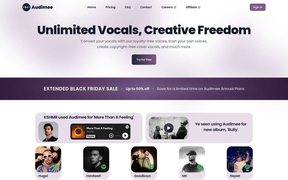 Audimee 适用于制作单曲翻唱、创作演示、快速原型制作以及为影视、广告或游戏生成合适的人声素材。平台界面倾向于即用型工作流程,支持在线试用并提供订阅计划(例如促销折扣),使创作者能在成本可控的前提下大量尝试不同人声方案。网站中展示了 KSHMR、Ye、Hugel、Hardwell 等艺术家的使用案例,增强了产品的行业可信度。