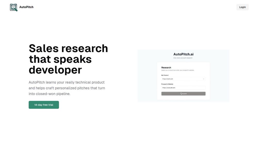 AutoPitch 是一款面向销售团队与 GTM(Go-To-Market)组织的 AI 驱动研究工具,专门解决“向技术人员销售”的难题。它通过抓取并整合多来源数据(包括公司官网、公开备案、Crunchbase 等 6+ 数据源),结合先进的 AI 分析,为每个目标账户生成可执行的研究报告与个性化推销文案,从而提高打开率和点击率,缩短成单周期。
