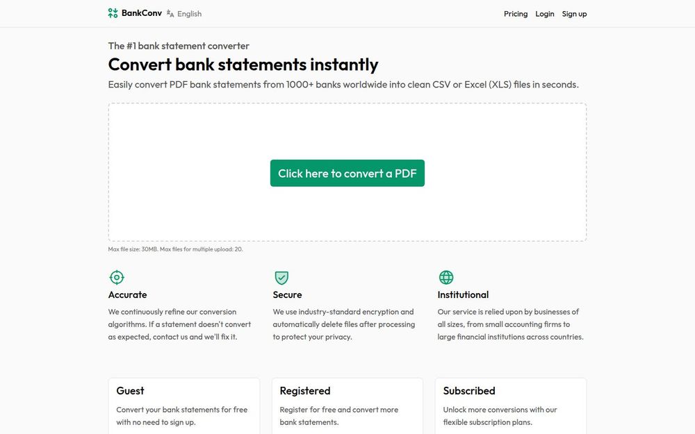 BankConv 是一款面向个人用户与企业的在线银行对账单转换工具,主打将 PDF 格式的银行对账单快速而准确地转换为可编辑的 CSV 或 Excel(XLS)文件。页面支持拖放上传并由 PQINA 提供上传组件支持,方便用户在浏览器中直接操作。服务以转换速度、转换准确度与安全性为核心卖点,适用于预算管理、会计对账、数据分析等场景。