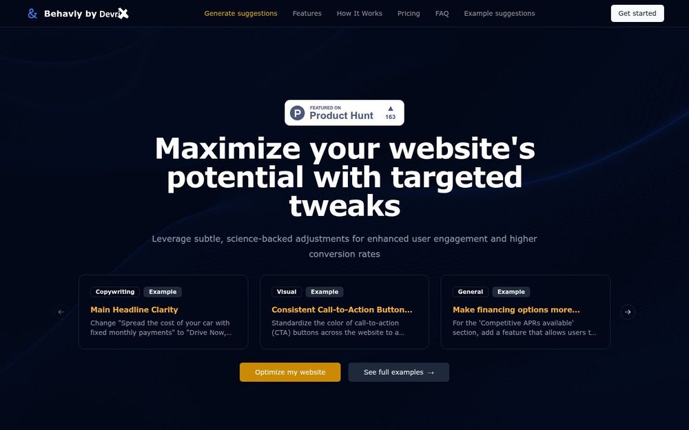 Behavly 是一个以行为科学与产品设计为基础的网站优化平台,专注于通过小而精的改动提升网站的用户体验和转化效果。平台结合人工智能分析与专家建议,针对页面文案、视觉元素和整体信息架构给出具体可执行的优化项,帮助团队在有限资源下实现最大化的转化改善。