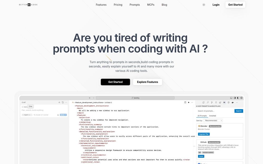 Better AI Code 是为开发者、产品经理和 AI 工程师设计的一站式提示构建与管理平台,目标是将自然语言需求快速转换为高质量、可复用的编码提示(prompts)。平台强调结构化模板、实时构建器与市场化的提示组件(MCP),以降低提示设计门槛、提升生成结果一致性,并支持多种 IDE 集成以便于在真实开发流程中使用。