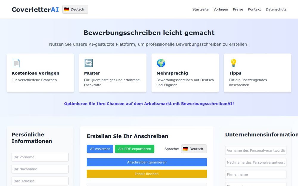 选择 BewerbungsschreibenAI 的理由在于其将 效率 与 专业性 结合:用户既能快速产出高质量求职信,又能针对岗位要求进行细化与优化。平台操作简便、模板实用、支持多语言与 PDF 导出,适合希望在短时间内提高求职竞争力的人群。此外,AI 辅助的个性化建议有助于用户在信息量大的招聘市场中脱颖而出,从而提高面试邀请率与求职成功率。