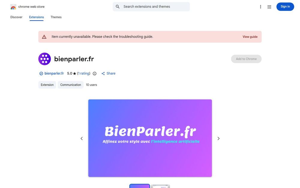bienparler 是一款为法语写作者设计的 Chrome 扩展,旨在通过人工智能帮助用户把平凡或简单的句子改写为更流畅、专业且有说服力的表达。扩展由 bienparler.fr 网站所有者发布,面向邮箱、即时通讯和网页文本输入等多种写作场景。发布页面显示该扩展评分良好(5.0 分,1 个评分),并明确声明不会收集或使用用户数据,开发者提供隐私政策链接以供核验。