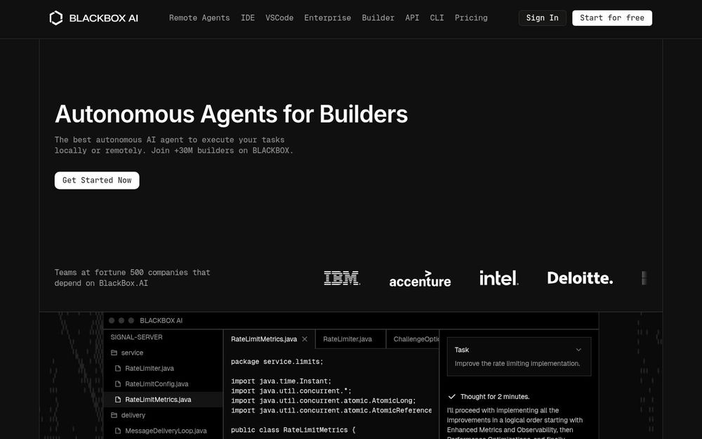 BLACKBOX AI 是一套面向“构建者”(Builders)与企业的自主代理平台,旨在把复杂的编码、测试与长期运行任务交由可控的 AI 代理执行。平台支持本地与远程执行、IDE 插件(包括 VSCode、JetBrains 等)、多代理并行执行以及通过主席 LLM 在多个实现中选出最优结果。适用于需要高吞吐、可观测与企业级安全部署的团队。