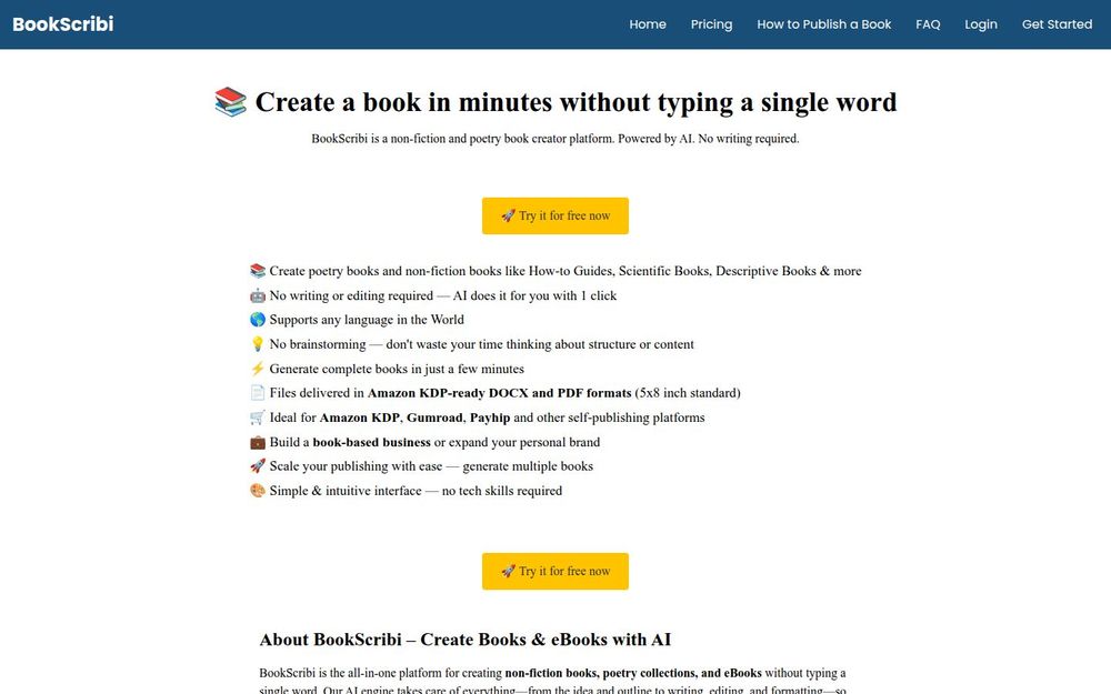 BookScribi 是一款面向非虚构书籍与诗集创作的 AI 平台,目标是把复杂的写作、编辑和格式化流程自动化,用户无需敲一行字即可产出可出版的成品。平台支持任意语言输出,并直接提供适配 Amazon KDP 的 DOCX 和 PDF(5×8 英寸) 文件,免去格式调整和版面排版的烦恼,使发布流程更顺畅。