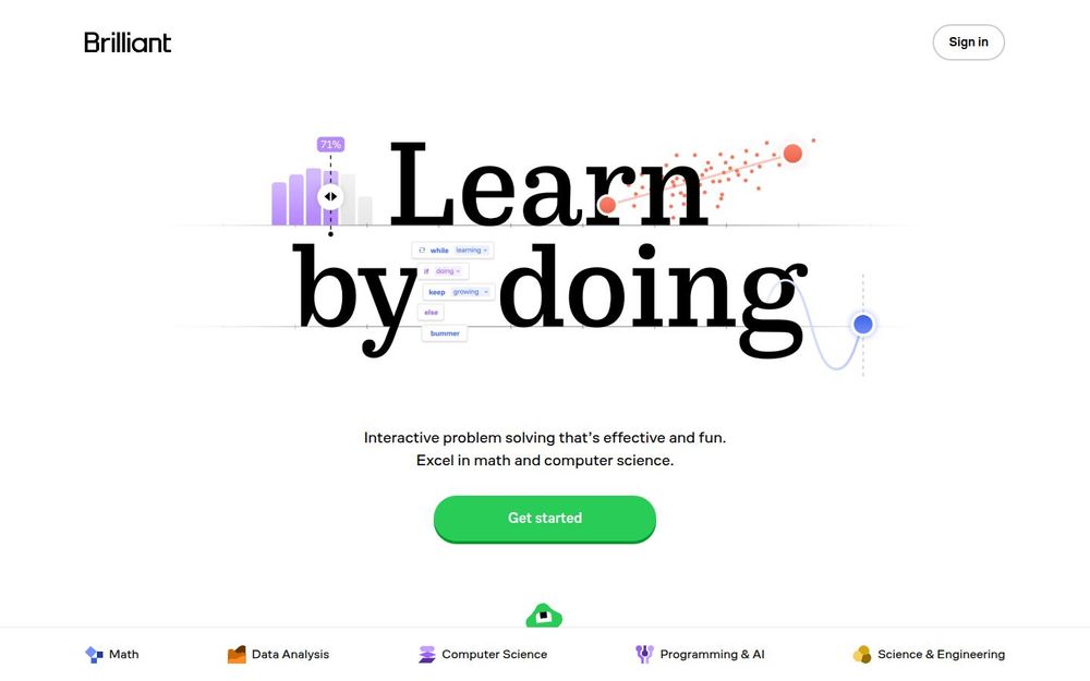 Brilliant 是一个面向数学、计算机科学、数据分析与工程等领域的在线学习平台,核心理念是“通过做中学(Learn by doing)”。平台以交互式题目和可视化工具为基础,强调实践操作与即时反馈,帮助学习者在解决实际问题中掌握概念与技巧。Brilliant 既适合希望巩固基础的学生,也适合准备竞赛或深化专业能力的学习者。