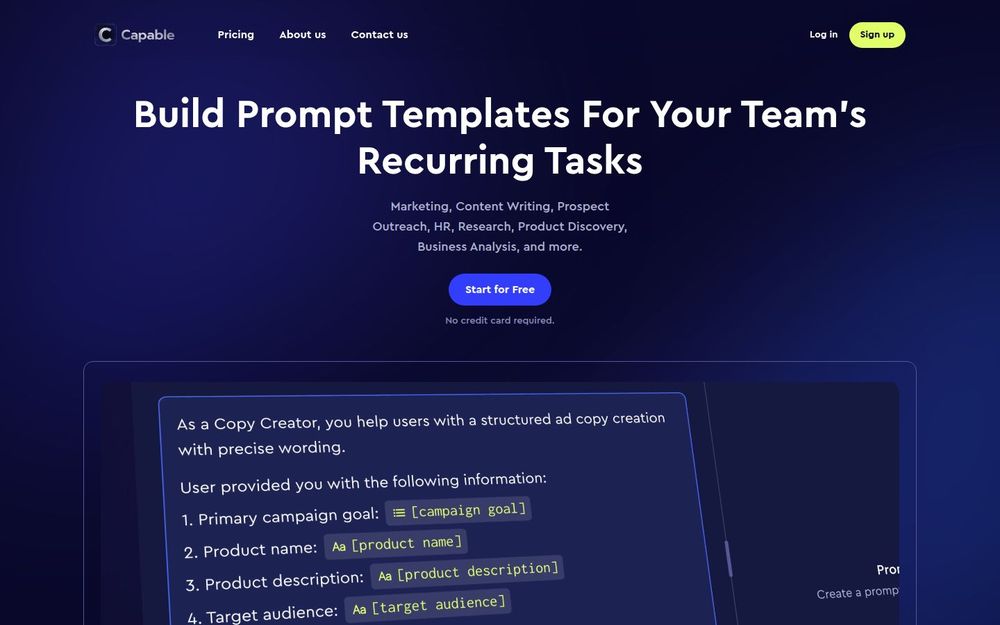 Capable 适合希望把“提示”从个人习惯升级为团队能力的组织。它不仅提供了构建与分享模板的基础设施,还强调变量化和场景化的复用方式,使知识能在团队内传递与标准化。对于想快速降低重复工作时间、统一输出质量并节省工具开支的产品、运营和市场团队,Capable 是一个高性价比的选择。平台的免费策略与对自有 API 的支持也降低了试用门槛,便于团队先行验证再逐步规模化应用。
