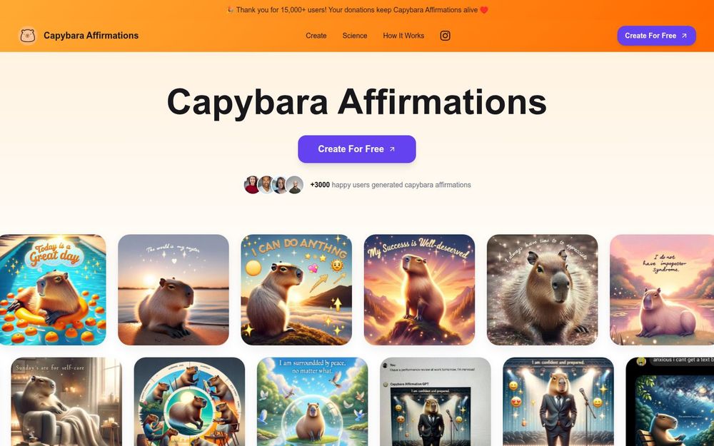 水豚肯定语(Capybara Affirmations)是一个以“水豚”形象为核心的 AI 驱动产品,旨在通过个性化肯定句为用户带来即时的情绪支持与积极暗示。界面简洁、交互轻松,用户可以在短时间内生成带有水豚插图的肯定语图片,用作壁纸或分享给朋友。项目已获得媒体报道与用户好评,并接受捐赠支持持续运行。