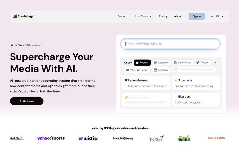 Castmagic 适合营销与创意机构、企业内内容/媒体团队、播客网络与制作工作室、以及需做高频内容分发的高管个人品牌团队。常见应用包括:把访谈转为系列社交内容、为客户从单条录音构建多频道传播活动、以及为播客或视频建立可复用的内容库与团队流程。