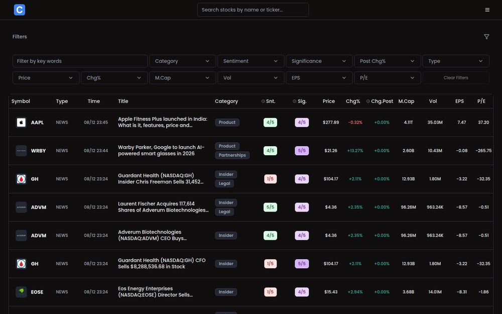 Catalist 是一个以股票新闻与事件为核心的聚合型信息平台,旨在将公司公告、媒体报道、内幕交易、产品发布、并购与财报相关的信息以结构化方式呈现。页面以表格形式罗列每条新闻的关键维度,包括股票代号、新闻类型、发布时间与标题,同时显示分类、情绪评分与重要性评分等辅助判断指标,并配套当前价格、涨跌幅、市值、成交量、EPS 与 P/E 等财务数据,帮助用户在信息海量涌现时快速筛选与判断。