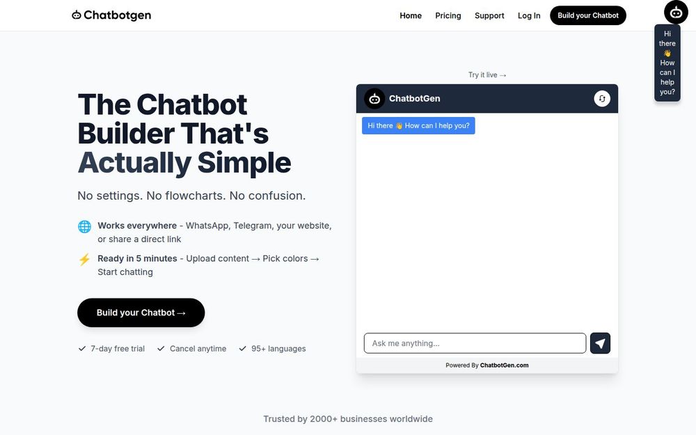 ChatbotGen 适合追求速度与简洁的团队或个人,特别是那些没有工程资源但希望快速把知识内容转化为可对话体验的组织。其无需配置复杂 AI 参数、可视化展示与内置数据收集能力,使其既能作为客服自动化工具,也能用于教学、预订与引导转化等场景。对于需要多渠道覆盖(网站、WhatsApp、Telegram)并希望保持品牌一致性的用户,ChatbotGen 提供了实用且易上手的解决方案。