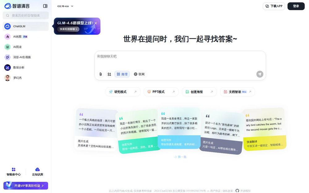智谱清言(ChatGLM)是围绕 GLM-4.6 模型构建的中文 AI 平台,旨在为个人与企业用户提供高质量的问答、创作、检索与多模态理解服务。页面展示了多种交互与使用方式,包括在线体验、扫码智能体、名片保存与分享、以及客户端与浏览器插件的下载提示。产品同时关注合规与开源属性,页面列明了用户协议、隐私政策与若干备案信息。