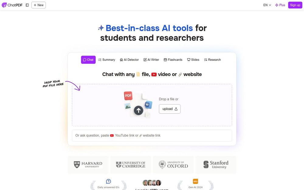 ChatPDF 是一款专为文档理解与研究工作流设计的 AI 工具,允许用户上传 PDF、Word、PPT、Markdown 等多种文件格式,随后以对话形式向文档提问。其目标是将繁复的阅读过程简化为即时问答、摘要与引用追溯,适用于学生备考、研究人员阅读论文、以及专业人士处理合同或报告。