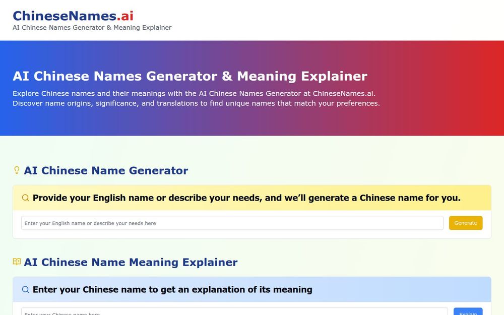 ChineseNames.ai 是一个基于 AI 的中文姓名生成与含义解析平台,旨在为非中文母语或对中文姓名文化感兴趣的用户提供便捷、可信的命名与释义服务。网站将姓名生成、意义解释、以及大量的名字示例与分类(如常见姓氏、古代人物、男女名)整合在一起,既可用于实用命名,也可作为学习中文姓名文化的参考工具。