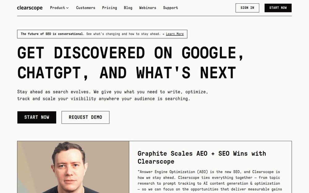 Clearscope 将传统 SEO 与面向 AI 的发现机制结合,提供端到端的内容可见性方案。无论是单兵创作者还是大型企业团队,都能通过它减少猜测、提升效率,并用数据驱动的优化保持长期搜索与 AI 引擎中的竞争力。
