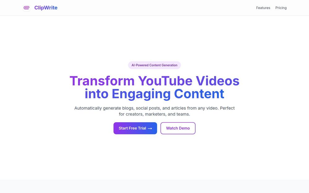即时转换(Instant Conversion): 在高级 AI 模型的支持下,ClipWrite 能在约 30 秒内将视频转写并生成可发布的文章或社媒文案,显著减少内容产出时间。