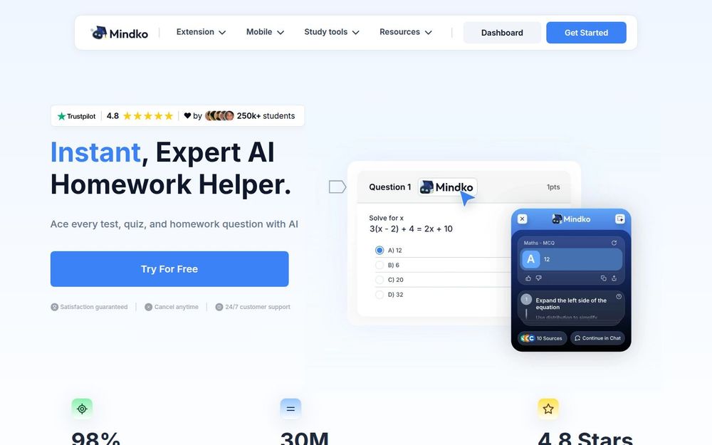 Mindko 适合需要高效解题与循序渐进学习的学生。它不仅能提供准确率较高的答案(官网宣称高达 98%),还能通过逐步讲解与后续追问功能加深理解。多平台覆盖(浏览器扩展、移动端、AI 聊天)使得学习场景灵活,在课堂外、在线测验或备考复习时均能发挥作用。对那些时间紧张或希望通过样题快速掌握知识点的用户尤为合适。