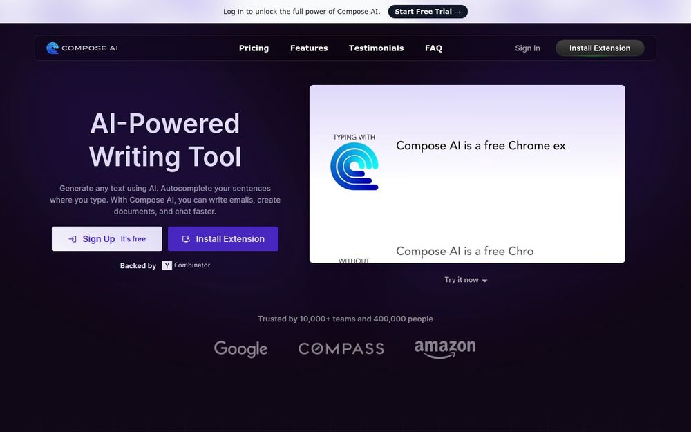 安装 Chrome 扩展即可开始使用,官网提供使用指南与教学视频帮助上手。若遇到问题,可通过支持邮箱或官网提供的联系方式获得帮助。Compose AI 还在页面展示了来自投资方(如 Y Combinator)与客户评价,作为可信度与效果的佐证。