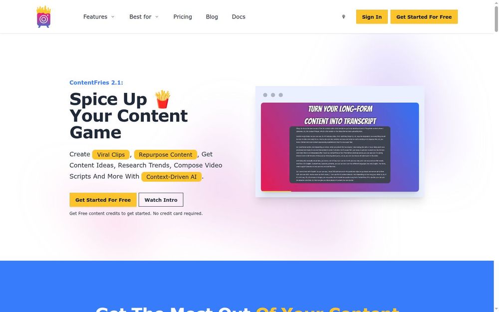 总之,ContentFries 以上下文驱动的 AI、强大的批量化与模板化能力以及多语言字幕支持为核心优势,能显著加速内容复用流程与跨平台发布效率。对于需要规模化生产短视频并保持视觉与信息一致性的团队来说,它是一个值得试用的工具(页面提供免费试用,且无需信用卡)。