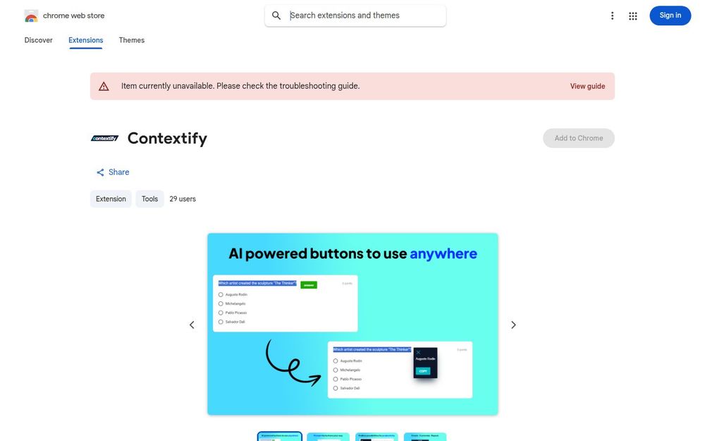 页面提示“Item currently unavailable”,安装或访问时若遇到不可用问题,请先查看扩展页面上的故障排除指南或 Google Chrome Web Store 的帮助文档;如需进一步支持,可通过开发者邮箱 info@getcosmoai.com 联系。页面显示该扩展当前用户较少(如 29 名用户)且暂无评分,建议在使用前先参考隐私政策与开发者说明以评估合规性和稳定性。