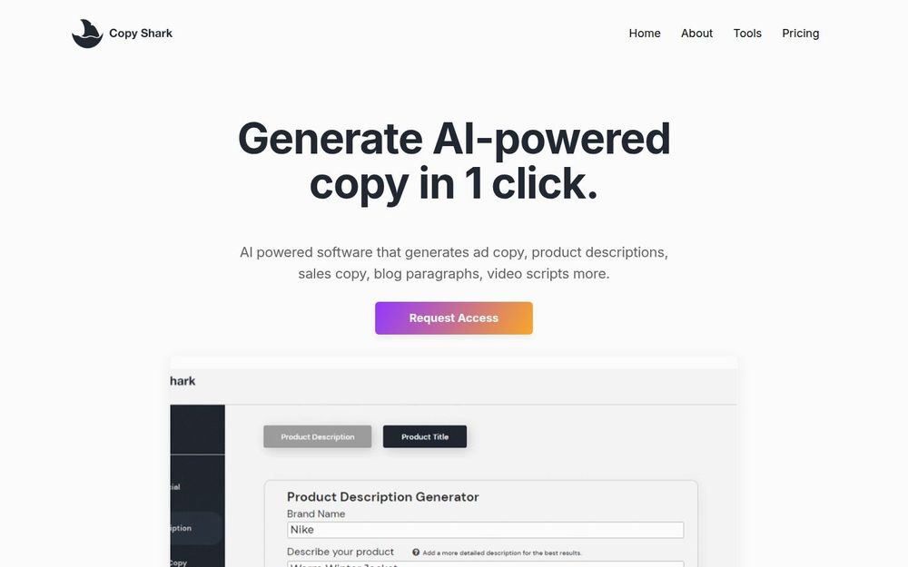 Copy Shark 是一款以 GPT-3 为核心的 AI 文案生成工具,旨在通过自动化写作流程帮助企业和个人快速产出高转化的营销与内容文案。平台主打“一键生成”,覆盖广告文案、产品详情、视频脚本、邮件、SEO 描述等多种场景,强调速度与可扩展性,适合需要大量文本产出的电商与营销团队。