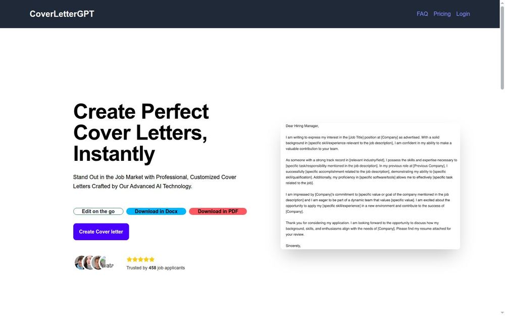 CoverLetterGPT 是一款面向求职者的 AI 驱动工具,旨在帮助用户快速创建符合职位需求且具有个性化风格的求职信。通过简洁的输入界面,用户只需提供个人信息与职位描述,系统便可在短时间内生成可编辑的求职信草稿,支持多种语气选择与不同输出格式。该服务兼顾效率与专业性,适用于应届毕业生、职业跳槽者以及希望提升求职成功率的在职人士。