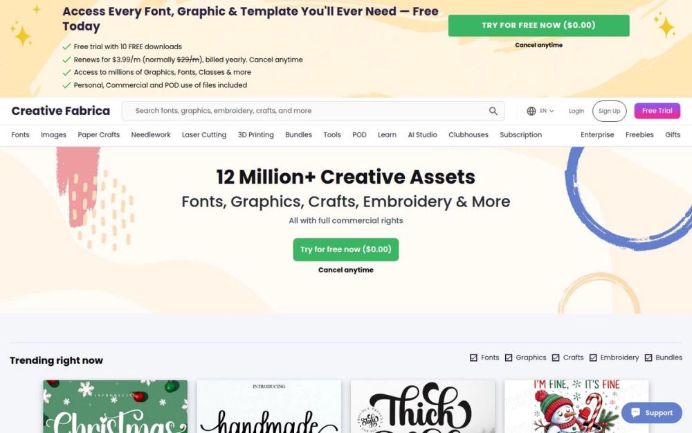 Creative Fabrica 是一个专注于字体与创意素材的在线市场,聚合了字体、图形、模板、刺绣与工艺素材等多类型资源,并提供教学课程与设计工具。平台以订阅制(All Access)为核心服务,同时提供免费试用(含 10 次免费下载)与按需购买选项。Creative Fabrica 强调素材的商业授权(包括 POD 使用),使设计师和电商卖家能够安心用于产品制作与销售。