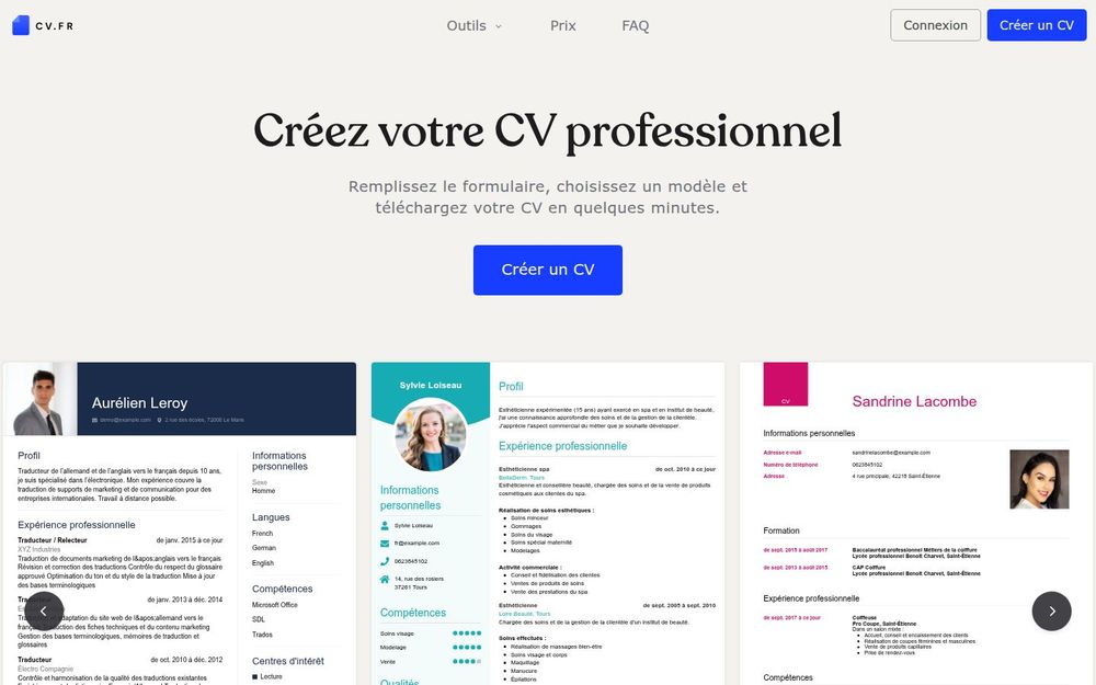 CV.fr 是一款面向求职者的在线简历生成与职业管理工具,目标是让用户在几分钟内完成专业简历的制作与下载。界面以法语为主,提供直观的填写流程与丰富的模板选择,适合希望快速得到规范、漂亮简历的学生、职场人士与职业转型者。平台同时辅以求职建议、示例与常见问题,帮助用户在内容与形式上都达到招聘者的预期。